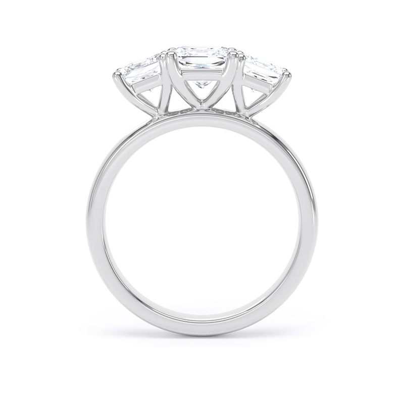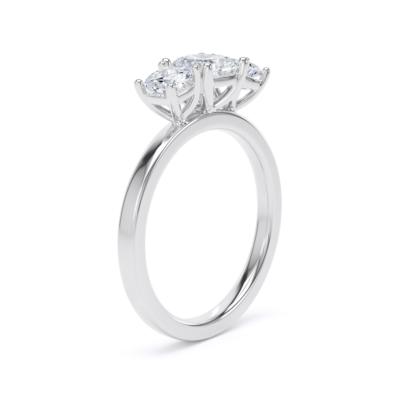 Softer than a princess cut, but sharper than a round brilliant, this cushion cut diamond trilogy ring strikes a balance between the two.