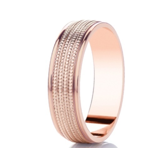 Made to last a lifetime, this 6mm wide, soft court wedding ring has diamond cut detailing. Four rows of mille-grain add textural detail to the centre of this ring, a contrast to the highly polished borders either side.