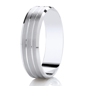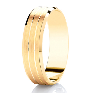 Made to last a lifetime, this 6mm wide, flat profile wedding ring has diamond cut detailing. The brushed, satin finish centre contrasts the highly polished bevelled edges and two diamond cut tracks of this flat profile ring for a design that is sleek and sophisticated.