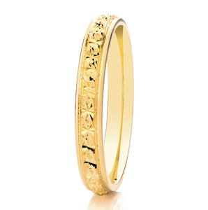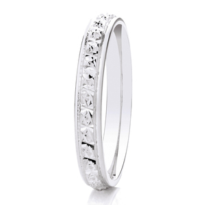 Made to last a lifetime, this 2.5mm wide, court profile wedding ring has diamond cut detailing. The clever diamond cut pattern all the way around the band gives the illusion of a ring fully-set with sparkling diamonds, for a fraction of the price.