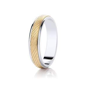 Made to last a lifetime, this 6mm wide, court wedding ring has diamond cut detailing. Delicate yet striking in two colours, the diamond cut tyre pattern add textural detail to the centre of this ring, whilst the borders either side have a contrasting highly polished finish.