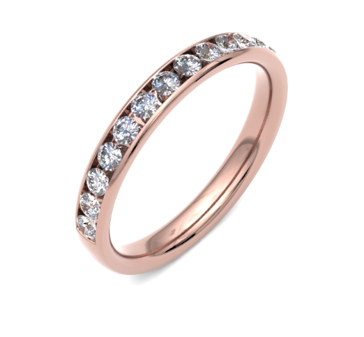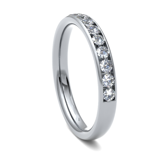 A timeless classic, this 3mm wide, court profile wedding ring is channel set with round brilliant cut diamonds.