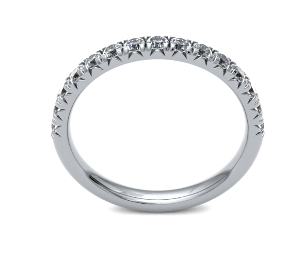 A modern classic, this 2.4mm wide, D shape wedding ring is diamond set with decorative, fishtail setting.