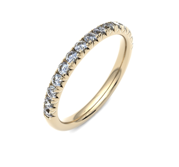 A modern classic, this 2.4mm wide, D shape wedding ring is diamond set with decorative, fishtail setting.