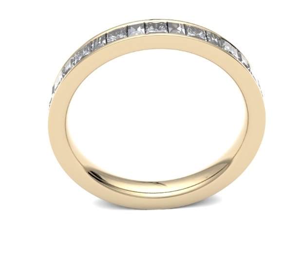 This ring offers a modern twist on the classic diamond channel set. The 3.1mm wide court profile wedding ring is channel set with alternate, princess and baguette cut diamonds.