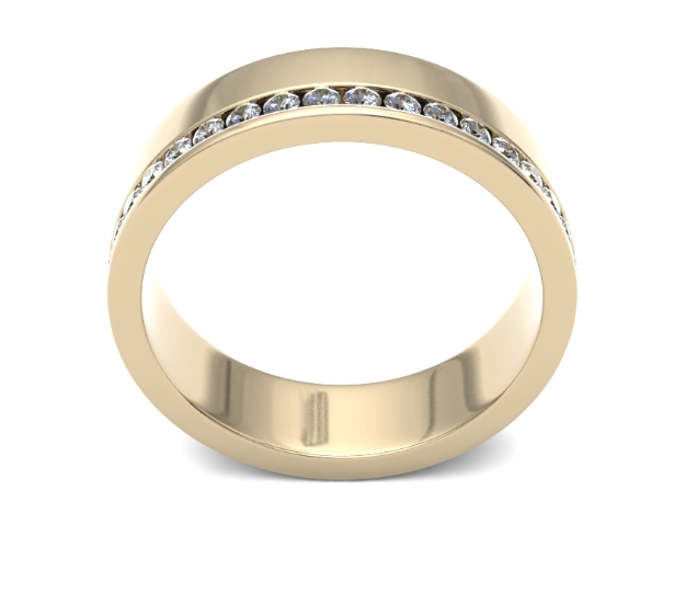This contemporary style, 5.1mm wide, court profile wedding ring has an off centre channel, set with round brilliant cut diamonds.