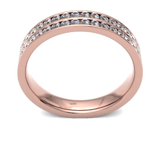 This ring offers a modern twist on the classic diamond channel set. The 4mm wide court profile wedding ring is channel set with two rows of round brilliant cut diamonds.
