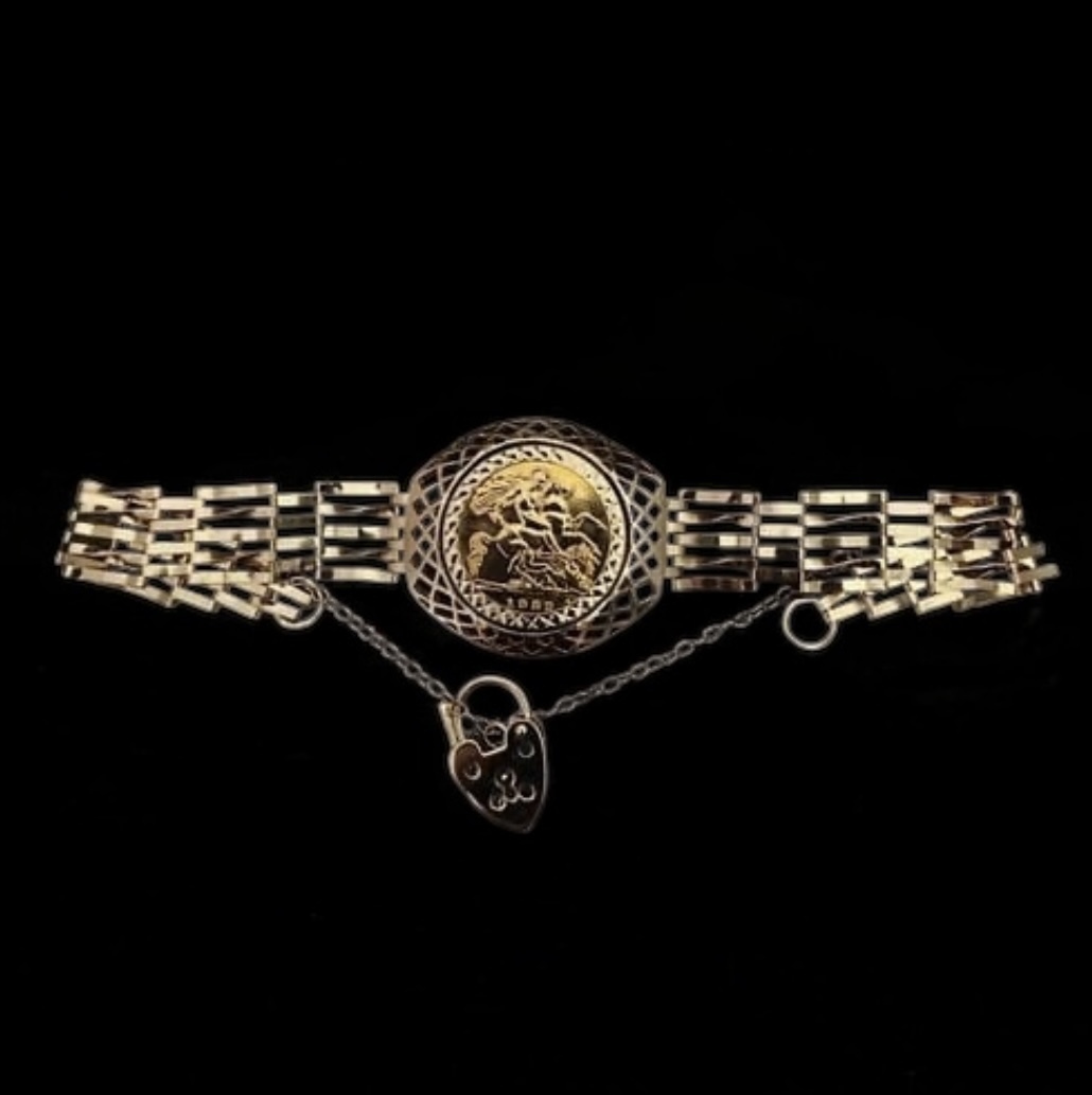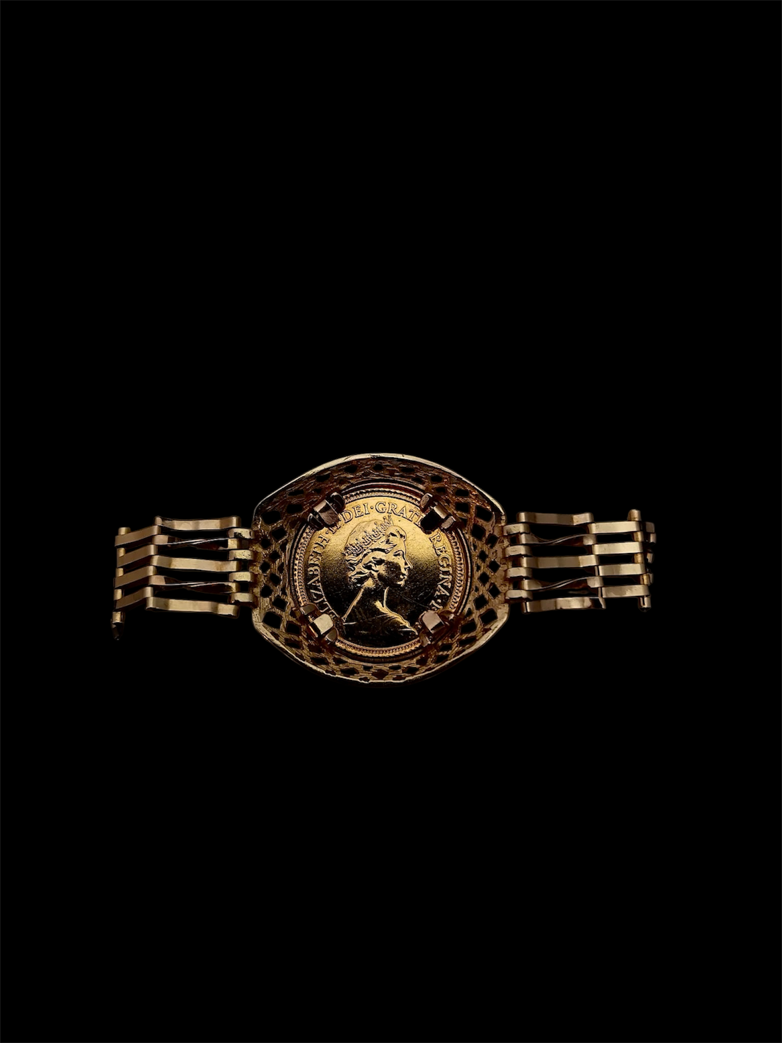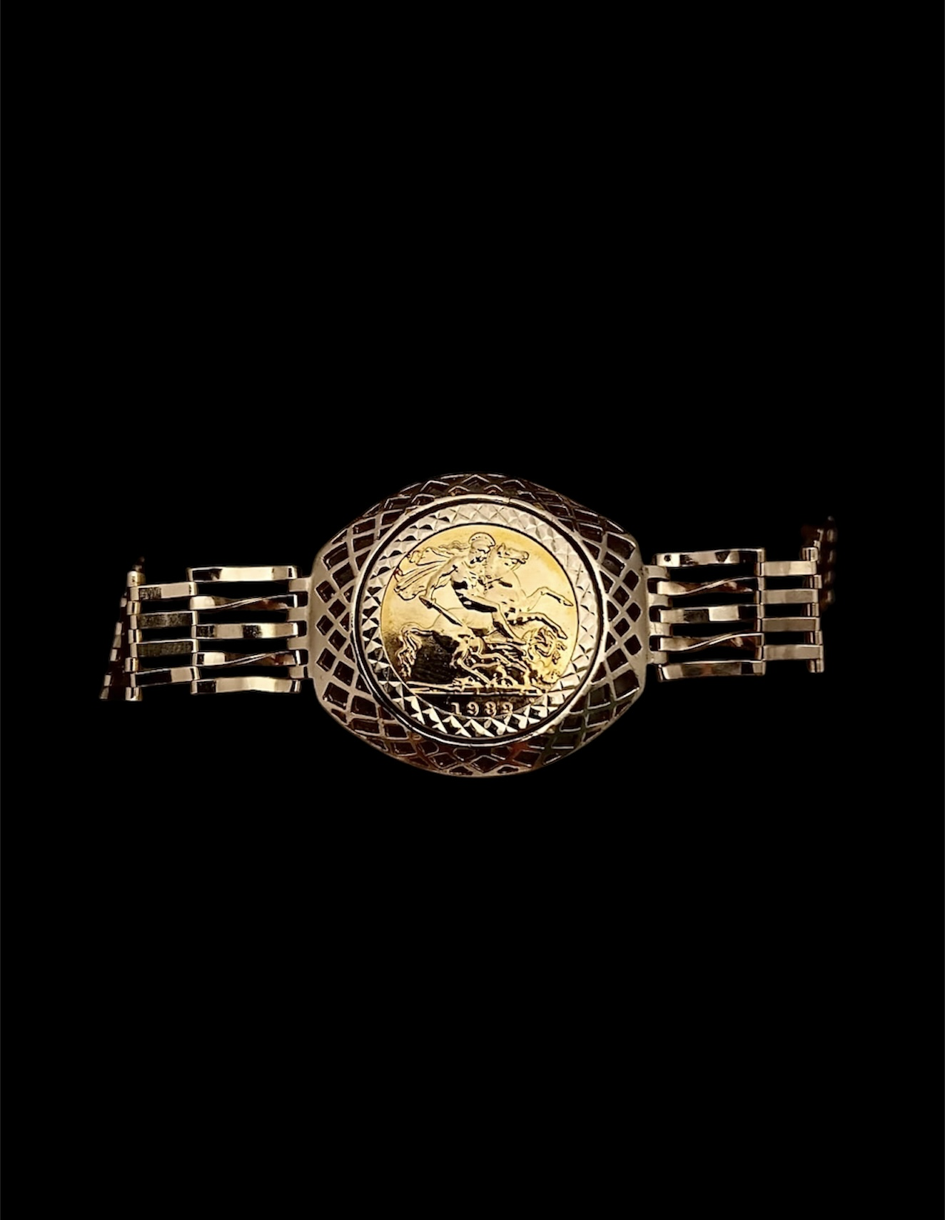 This 9ct yellow gold gate bracelet is mounted with a genuine half sovereign coin, dated 1982 depicting Queen Elizabeth II on the reverse side of the coin.