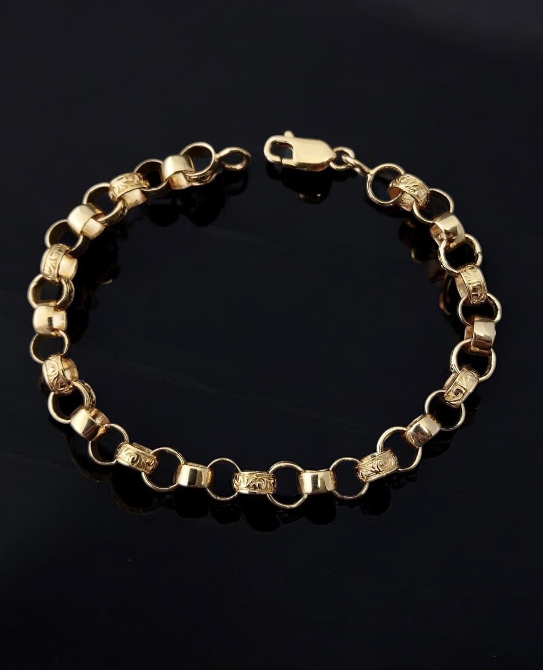 Each alternate link is embellished with engraved scrollwork which contrasts the highly polished plain gold links.